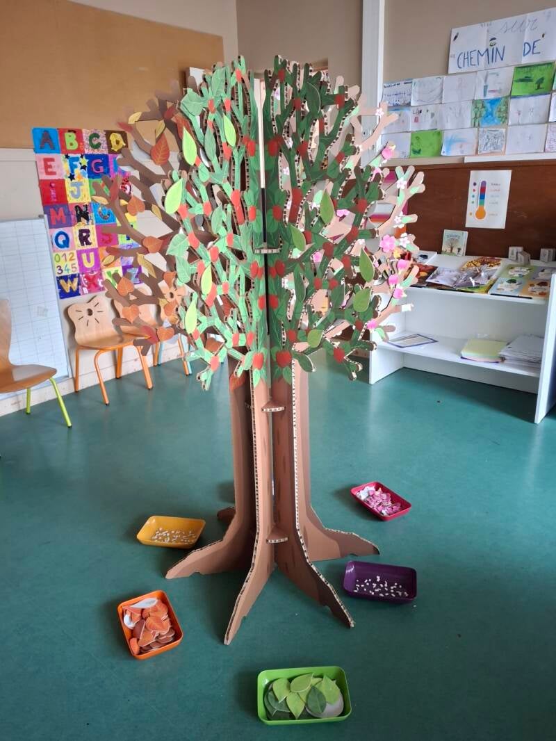 Autour d’un arbre en carton aux couleurs des 4 saisons, les enfants devront l'« habiller » avec les bons feuillages mis à leur disposition.